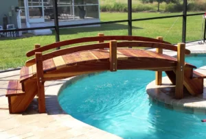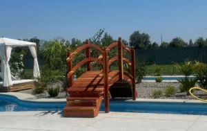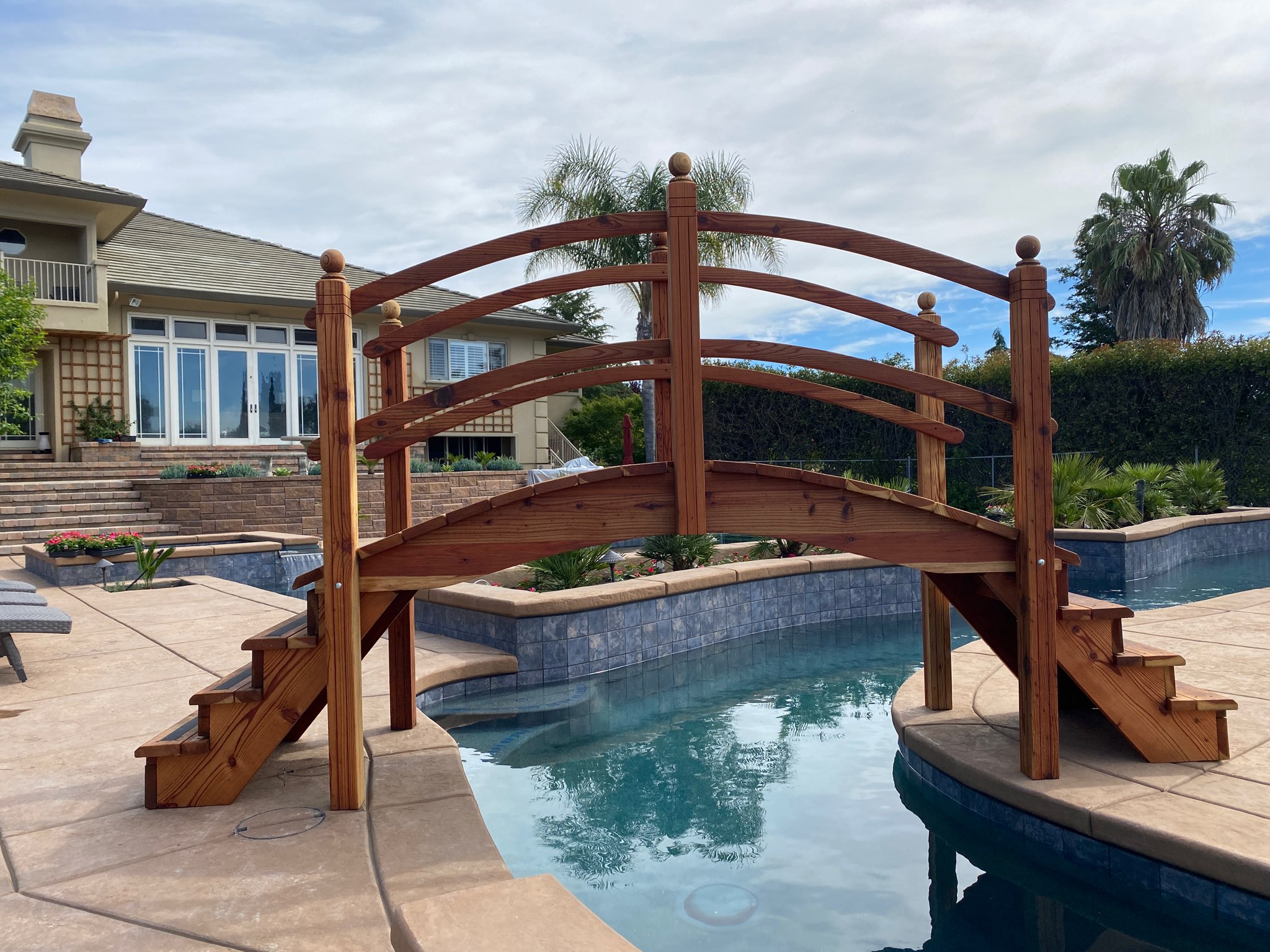 Here is a beautiful redwood 10 foot plank step bridge over a Awesome pool setting.