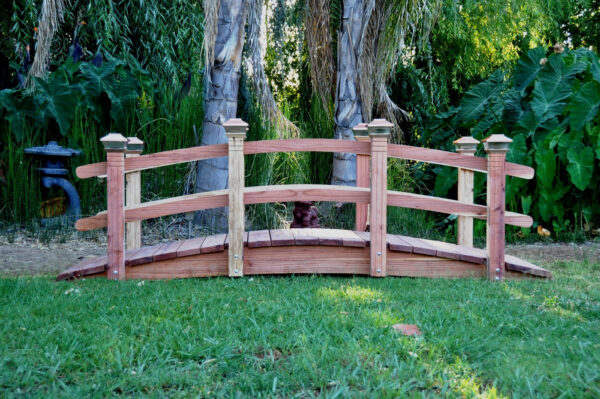 This breathtaking garden bridge features rails that match the same arch as the beams and square posts with decorative grooves and curving rails that flow from end to end. With ball caps or a great option solar copper top lights that give the bridge a touch of class and style to complement your pond, creek, stream, or yard.