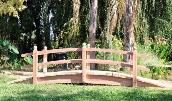 This bridge is completely fish safe. Redwood Garden Bridges does not use pressure-treated wood in construction, which makes this redwood bridge perfect for Koi Ponds or any of your landscaping needs.