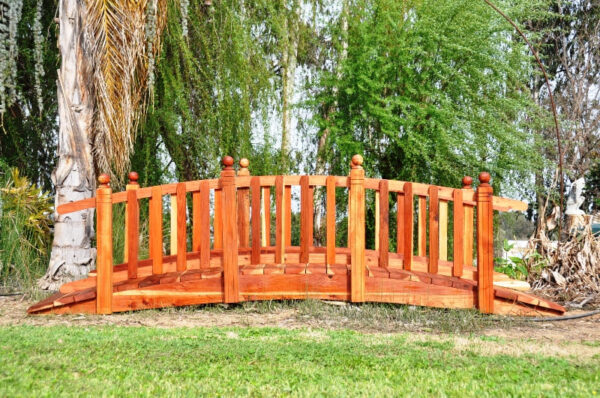 Bring the beauty of peaceful nature escapes to your garden with the Redwood Garden Spindle Curved Rail bridge. This single-rail bridge is hand-built with hand-selected California redwood. The wood and galvanized hardware will provide structure and stability despite being exposed to outdoor elements. This attractive garden bridge features square posts with decorative grooves and vertical spindles attached to a single curving rail. Spherical post tops give the bridge a touch of classic style to complement your pond, creek, stream, or yard.