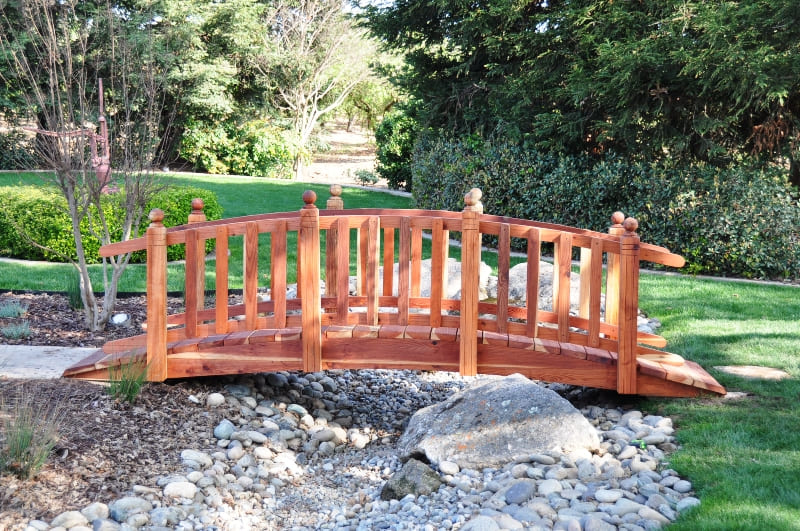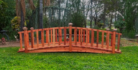 Because this wooden garden bridge has been pre-assembled, pre-drilled, and sanded, assembly is quick and easy and can be done in as little as 60 minutes. The only tools needed to assemble your bridge are a crescent wrench and a power screw driver. Choose from several bridge size options to suit your outdoor space. If you have any questions or a Custom Quote, you can contact our design consultant professional by calling and talk to Designer/Builder Joe 559 325-2597