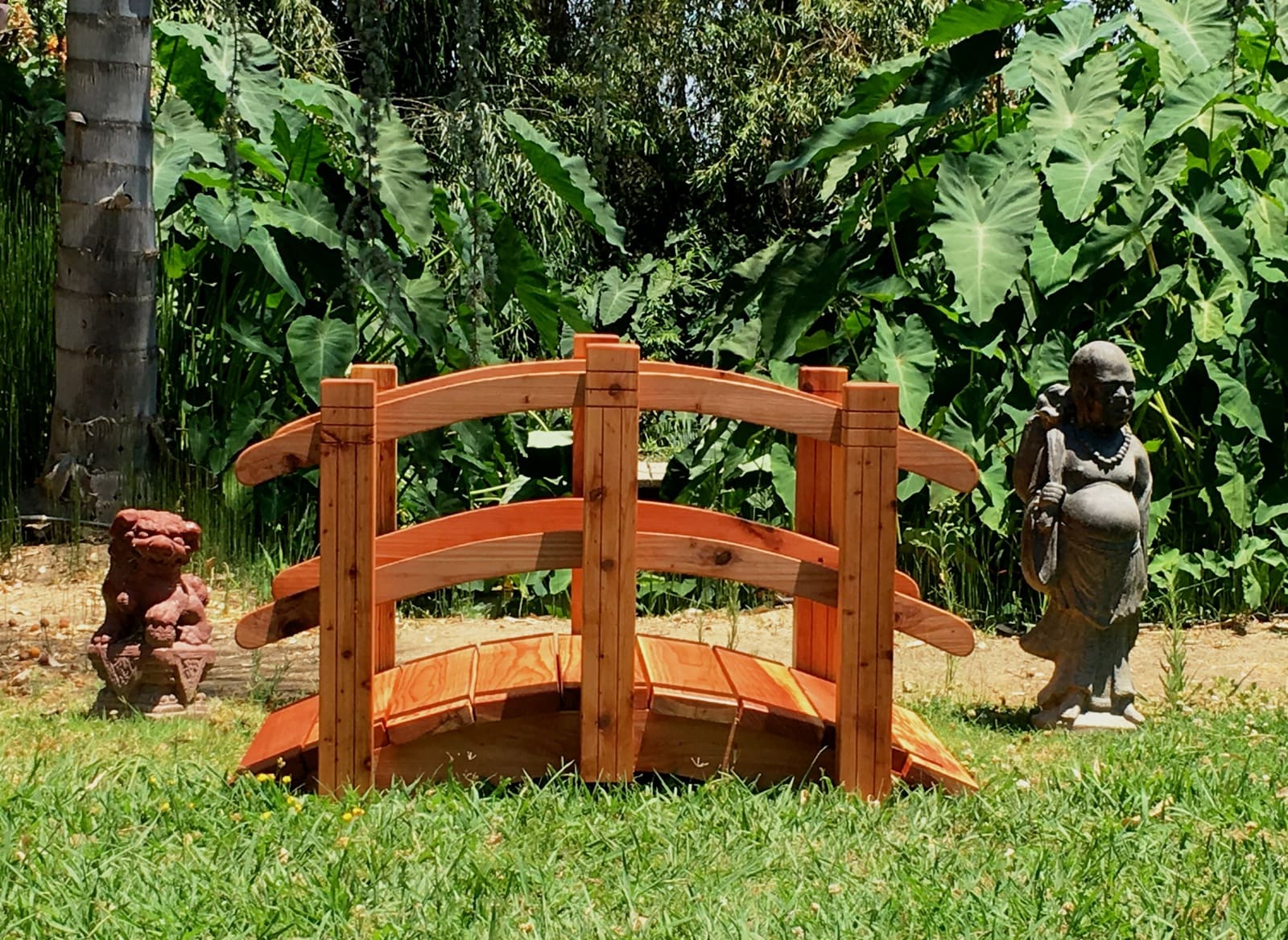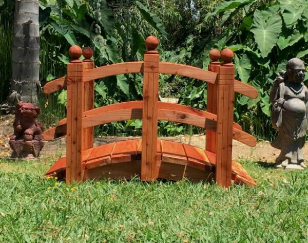 This bridge is completely fish safe. Redwood Garden Bridges does not use pressure-treated wood in construction, which makes this redwood bridge perfect for Koi Ponds or any of your landscaping needs.