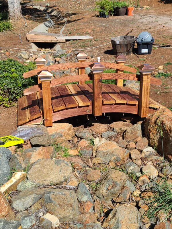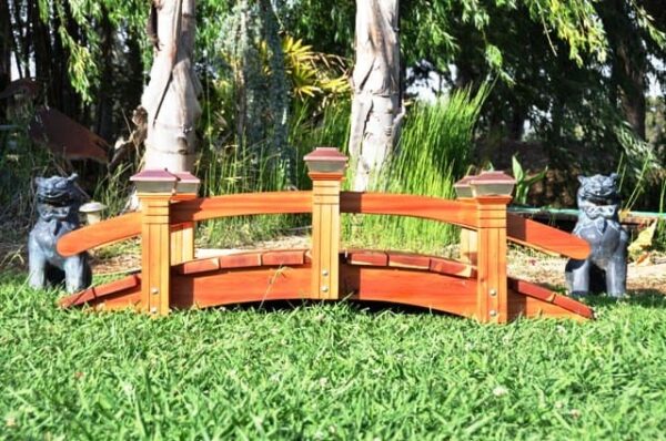 Shown here is a 6 foot short post bridge it can have ball caps or solar top lght s the choice is yours, We will customize this bridge to suit your landscaping needs.