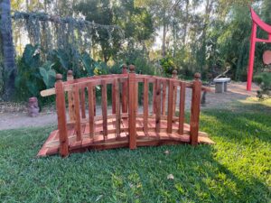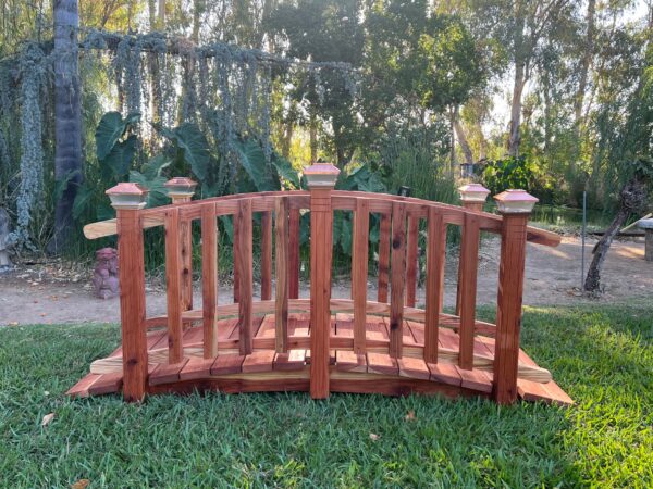 Because this wooden garden bridge has been pre-assembled, pre-drilled, and sanded, assembly is quick and easy and can be done in as little as 60 minutes. The only tools needed to assemble your bridge are a crescent wrench and a power screw driver. Choose from several bridge size options to suit your outdoor space. If you have any questions or a Custom Quote, you can contact our design consultant professional by calling and talk to Designer/Builder Joe 559 325-2597